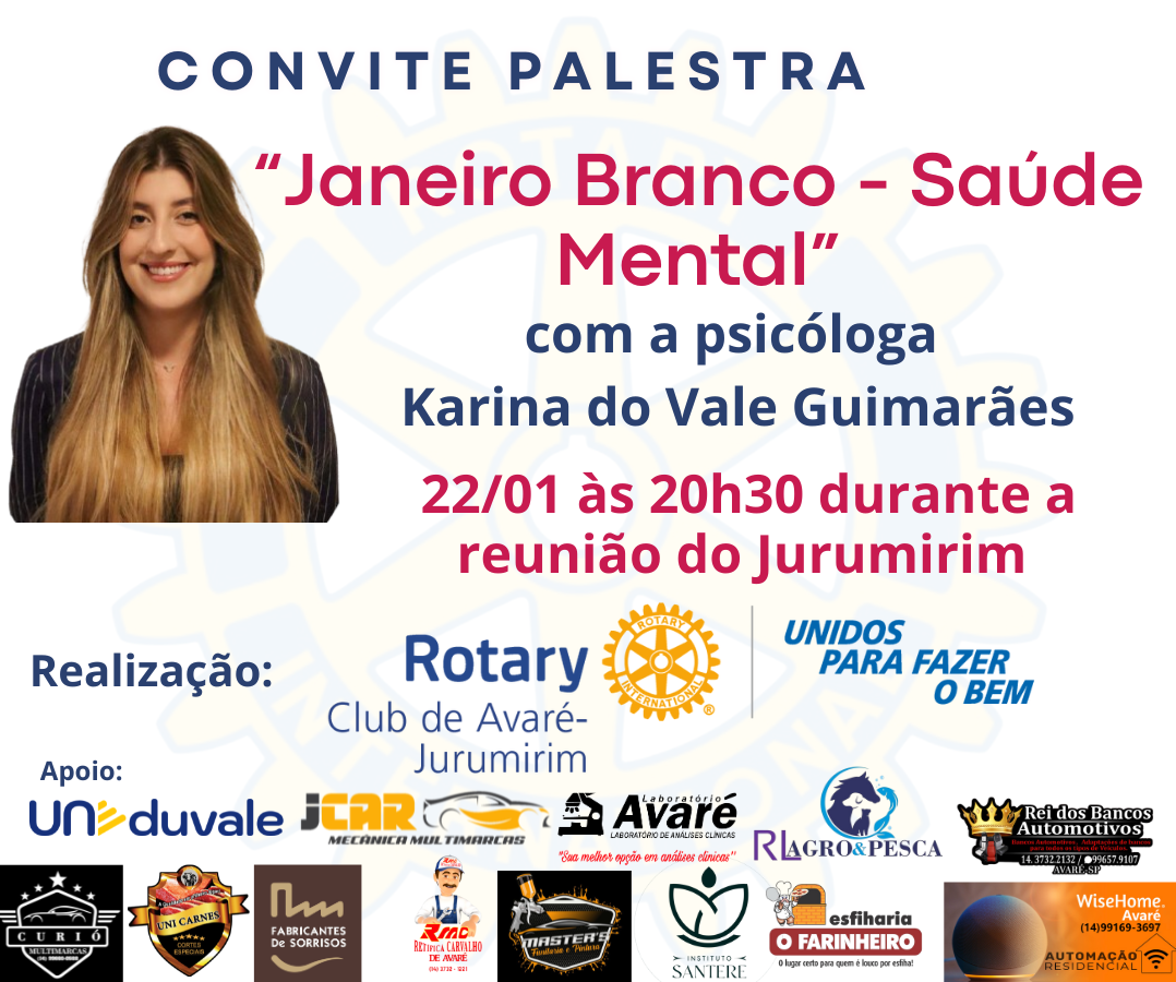 Nesta semanúde mea, em alusão ao Janeiro Branco será realizada palestra com a psicologa Karina do Vale Guimarães que falará sobre a saúde mental.