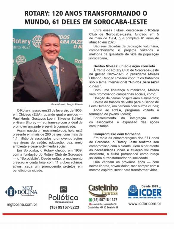 Entrevista ao Presidente do RC de Sorocaba Leste, Moises Rengifo, na Revista em Comemoração aos 371 Aniversario de Sorocaba